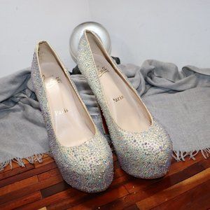 Pre owned Christian Louboutin Daffodile Crystal Heels. Size 41. It is still in good and stunning. Heel measures approximately 6.5 inches with a 2 inch platform.