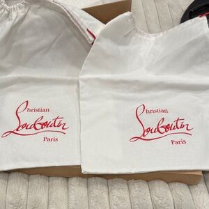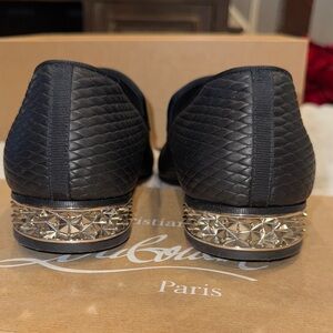 Christian Louboutin “Dandyrocks” Flat Elegant black loafers with textured embossed jacquard diamond design. All black calfskin leather round toe with sparkling silver spikes on block heels. Heel height is 1 inch. Features signature red sole. Black matte textured ribbon tuxedo stripe down back. Ideal for nice event for sophisticated style. Worn once. As pictured, some creasing on front. Soles show slight wear. Comes with in tact box and shoe bags. Size is EU 45.