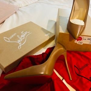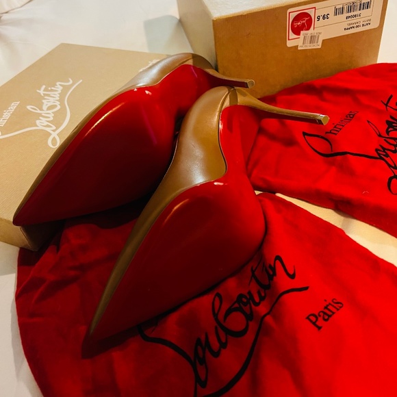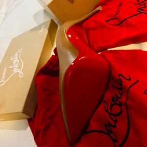 These shoes are brand new with box and two dust bags. They have only ever been tried on around the house but they simply do not fit me. As you can see I paid over $700 for them but I am now selling them for $100 off. They are currently selling for $795 so you are actually getting them for $200 which is a major bargain for louboutins because they rarely go on sale! The only thing I will say is there is a small tiny scuff at the front of the heel. It is barely noticeable but I have taken a photo of it anyway. The bottom of the heels are immaculate.