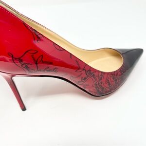 The Louboutin Degraloubi stiletto pump features the brand’s signature sleek and elegant silhouette. The shoe is crafted in glossy patent leather with a striking gradient effect that fades from black at the pointed toe to vibrant red along the sides and heel. Louboutin logos overlay the red portions, adding an artistic and edgy touch. The shoe has a slender high heel and the iconic red sole that is synonymous with Louboutin’s designs.