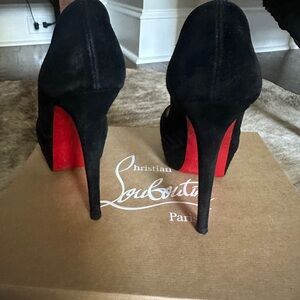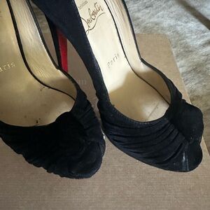 Size 37. Suede black peep toe. 6” heel. Box and shoe covers included.