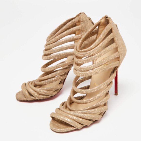 Christian Louboutin Gold/Brown Textured Suede Open-Toe Strappy Cage Sandals