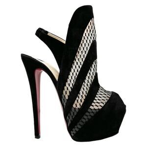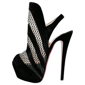 Keywords: Christian Louboutin Guizi 160 platform booties, black suede mesh heels, cutout stiletto sandals, 160mm Louboutin heels, Christian Louboutin mesh heels, designer platform stilettos, Louboutin high heel slingbacks, red sole shoes, peep toe platform pumps, edgy statement heels.