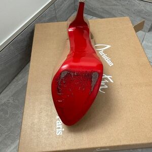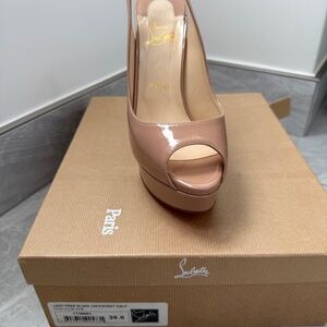Christian Louboutin high heels. Nude patent leather, lady peep sling back 150. Comes with original box, and dust covers.Gently used 100% Authentic