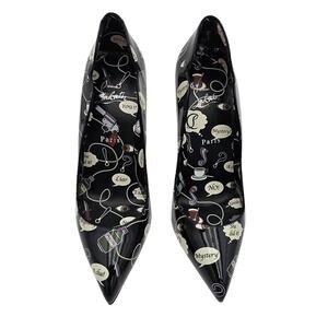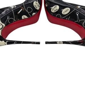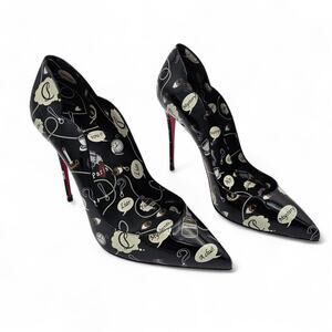 Crafted from high-shine black patent leather, these pointed-toe pumps are adorned with an eclectic all-over print featuring whimsical motifs such as keys, watches, perfume bottles, eyes, and playful phrases like “Mystery” and “Liar”. The cut-out scalloped topline—a hallmark of the Hot Chick silhouette—adds a seductive contour to the foot, while the sleek 100mm (4-inch) stiletto heel elongates the legs for an effortlessly glamorous look.