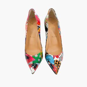 These Christian Louboutin Hot Chick 100 pumps feature multicolor abstract-printed glossy patent leather uppers with scalloped foot openings and pointed toes. Set on high stiletto heels and finished with the brand’s signature red leather outsoles, they bring bold artistry to a timeless silhouette.