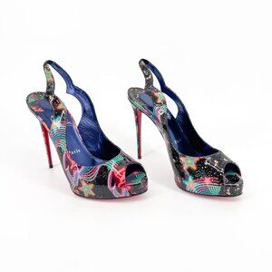 These Christian Louboutin Hot Chick Sling Alta 120 Pumps are a bold, eye-catching take on one of the brand’s most iconic silhouettes. The glossy black patent leather upper is printed with a vibrant multicolor neon light logo motif, adding a playful twist to the dramatic design. Featuring an almond peep toe and scalloped slingback strap, these pumps are finished with a hidden platform and soaring stiletto heel for striking height and shape. A leather footbed and lining ensure a luxurious fit, while the signature red sole and leather outsole complete the look. Perfect for nights out, special events, or making a statement wherever you go.