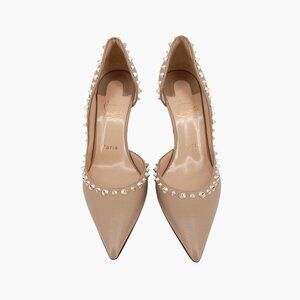 These Christian Louboutin Irishell 85 pumps feature beige Nappa leather uppers with silver-tone textured spike accents along the foot openings. Designed in a half d’orsay silhouette with pointed toes, high stiletto heels, and finished with signature red leather outsoles, they bring bold edge to classic sophistication.