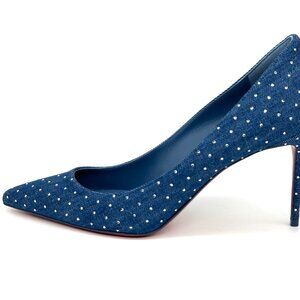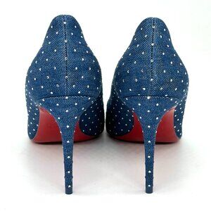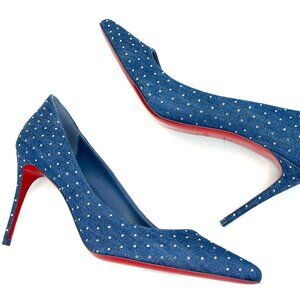 This iconic Christian Louboutin's Kate pumps feature a bold cut the elegantly reveals the foot. The pair is made from cotton denim with a rhinestone-adorned design that adds an elegant and glamorous touch and features elegantly pointed toes, heels that reach a height of 85 mm, and the signature red soles. With a comfortable heel, this shoe is a stylish choice for any occasion.