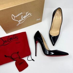 Step into luxury with these Christian Louboutin heels, featuring a glossy black patent leather upper and the iconic red lacquered sole. The sleek silhouette and pointed toe design make them a timeless addition to any wardrobe.