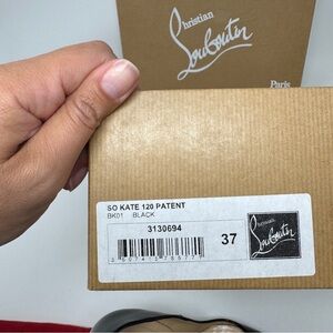 The So Kate iconic pump with timeless elegance brilliantly combines discretion and sophistication. Its all black patent calfskin features a sculpted upper that extends its lines to the iconic bold cut. It sits easy atop a slender 120 mm heel to give you confidence, underlining Maison Christian Louboutin know-how.