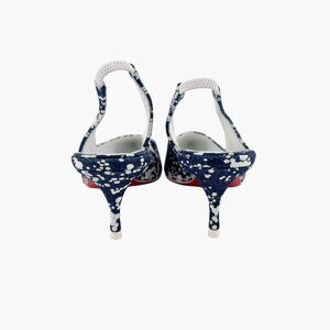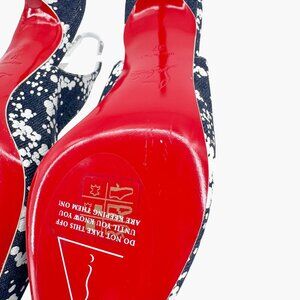These Christian Louboutin Kate Sling 55 pumps feature navy blue denim uppers with white specks, pointed toes, and a slim slingback strap. Set on a 2.25-inch kitten heel and finished with a signature red sole, they strike the perfect balance of polish and play for both workwear and weekend styling.