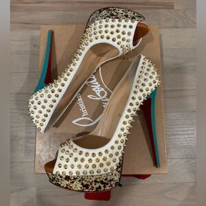 Authentic Christian Louboutin lady peep multi color size 42. They feature spike embellishments with peep toes and a colorful exterior. Completed with leather insoles, stiletto heels, and the signature red soles. Excellent condition gently worn. Comes withth box, dust bag, and extra heel taps.