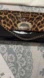 Elegant clutch with leopard pattern and sleek black finish. Features a stylish gold chain. Ideal for evening events.