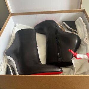 A transparent center bar at the wedge heel and gilt trim create an extraordinary floating effect on an almond-toe bootie crafted from supple calfskin. Christian Louboutin's iconic red sole-born from a fateful brush with red nail lacquer-lends distinctive brilliance to every step.