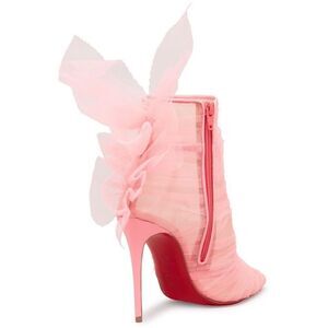 Pink all-over tulle bootie from Christian Louboutin. The Libellibooty is set on the So Kate Booty last with a 100mm slim stiletto heel. The upper features couture tulle plissage on the front and the sides, along with a winged back that mimics the wings of a dragonfly, framed with a grosgrain trim.
