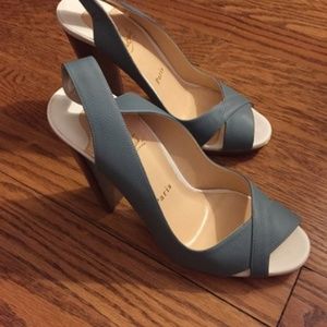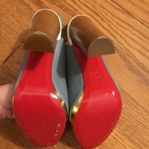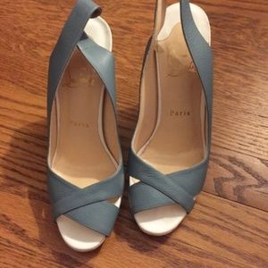 Like new! Classic Christian Louboutin "Morphea" slingbacks in light blue leather with chunky wooden heel and gold detailing. Worn 2-3 times on vacation - minimal scuffing on bottom, as shown. Great heel, just a little tight on me, so selling. They are a size 38 but run small; great for someone size 7. For more details, see them on the Bergdorf Goodman website here: https://www.bergdorfgoodman.com/Christian-Louboutin-Morphea-Colorblock-Crisscross-Slingback-Pumps/prod73460050/p.prod