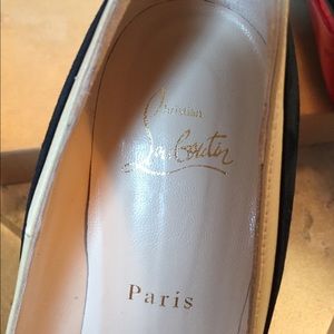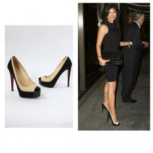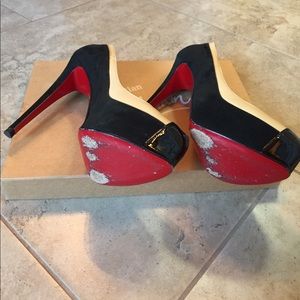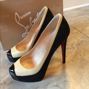 Beautiful authentic Christian Louboutin heels. These are in great used condition. Black patent toe cap with nude nappa leather and black suede. This pair goes with everything. 140 in height with a platform. Open to offers. Comes with CL box and iconic red shoe bag. No trades.
