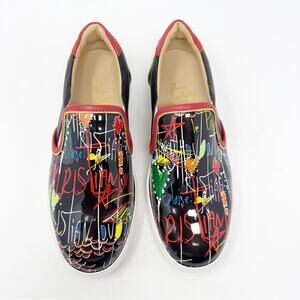 Luxury, designer, shoes, women’s shoes, women’s, slip on, graphic, statement, red bottoms, comfort, travel, black, red