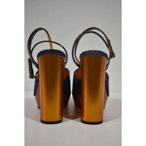 Size: 38 (know your Louboutin size) Name: Mira Colunata Color: Denim / Lin Brandy / Saba Gold Style: Wedge Sandal Style#: 1221129 Material: Miss Denim / Pat Miss Open front toe Dark blue denim fabric material Standing on a 120mm platform wedge
