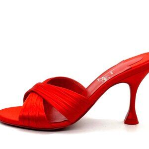 Elegant and expertly crafted, this slide sandal has lustrous silk-satin straps that are crisscrossed precisely to flatter the foot. A flared heel and lacquered red sole take the glamour up another notch.