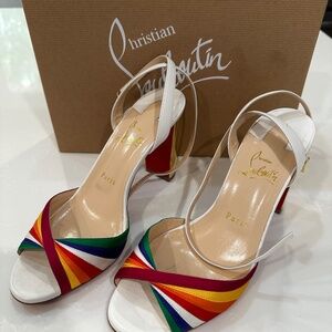 Absolutely gorgeous heels!! They are white with a multicolored top and gold heels. Unfortunately I can’t wear heels anymore and these shoes deserve to go out.