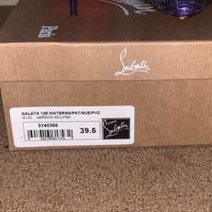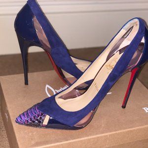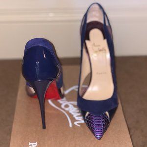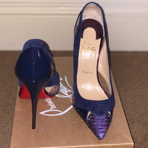 Elegant navy heels with striking red soles. Sleek design with pointed toe.