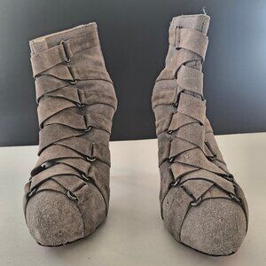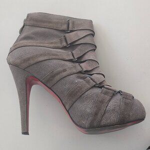 Tan/gray CL ankle boots. Boots have suede uppers with a squared toe, a concealed platform, and bandage straps that wrap across the front with buckles on either side. Finished with a back zip. Size 38, 120 mm heel.