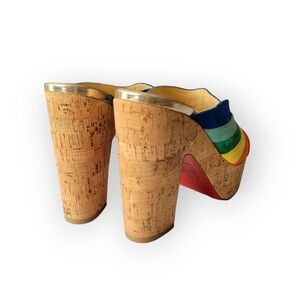 Christian Louboutin suede rainbow slide pumps with wooden block heels.