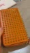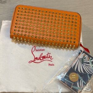 Vibrant orange wallet adorned with gold studs. Stylish and bold design. Perfect for a chic look.