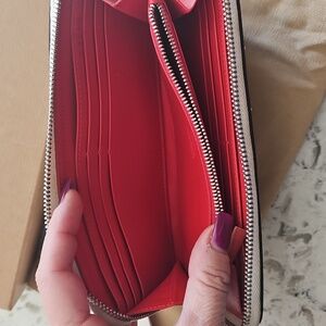 Callouts: minor signs of wear on the leather and hardware. Small spot near the zipper. Some coin residue in the coin pocket.