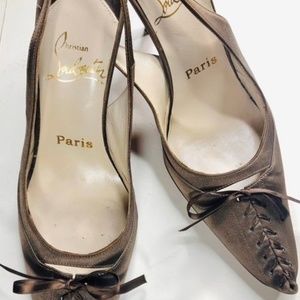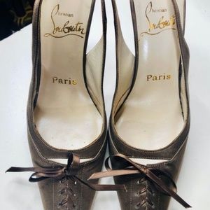 These beautiful Louboutin heels are so elegant. The lace-up ribbon on the toe adds so much beauty. The heel is - Champagne satin in color.