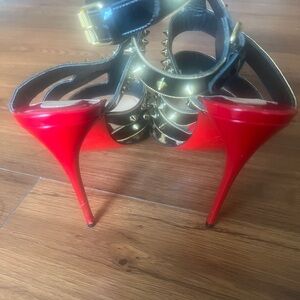This is an authentic CHRISTIAN LOUBOUTIN Patent Leopard Printed Studded Tchicaboum 100 Pumps in Version Brown. These are a fabulous pair of striking pumps crafted of patent leather in a leopard print. They feature black patent caged like straps that fit snug to the foot with a wrap-around adjustable ankle strap, both beautifully detailed with a small chain-link trim (some loose. See pics) and spiked studs and a 4-inch heel.