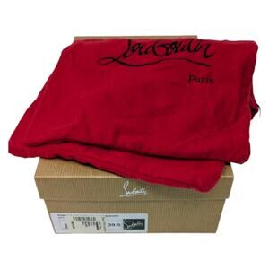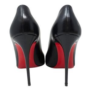 Christian Louboutin heels in soft black napa leather with iconic red soles, size 39.5. Gently preowned condition, with normal signs of use such as minor creasing/wear to uppers and scuffing to soles; faint lint residue at interior from being stored in red dust bags, as shown in photos. Includes original box and two dust bags.