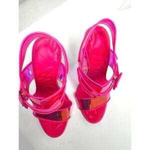 Crafted in Italy, these heels feature a vibrant fluorescent pink transparent PVC upper paired with smooth leather trim, creating a striking modern look. The open toe silhouette and adjustable ankle strap provide a flattering fit, while the iconic 100mm stiletto heel elongates the legs. Finished with Louboutin’s signature red lacquered sole, these sandals are the perfect statement piece for evening events, summer parties, or upscale occasions.