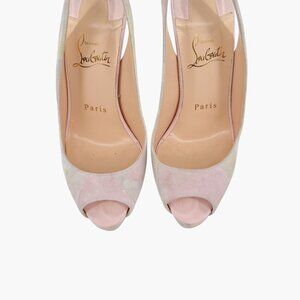 These Christian Louboutin slingback heels feature soft pink and multicolor watercolor suede uppers, a peep toe, and platform silhouette reminiscent of the iconic Lady Peep. The 5.5-inch stiletto heel is balanced by a 1.1-inch front platform, making them a bold choice for evening wear, parties, or standout styling.