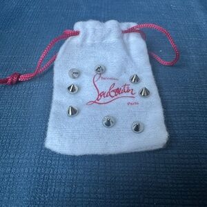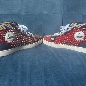 Christian Louboutin sneakers, crafted in a rare Denim finish. Featuring premium denim fabric, bold velvet like material overlaid with silver spikes and the iconic red soles— in the signature high-top silhouette. These sneakers offer bold style and superior craftsmanship. Lightly worn and in excellent condition. A must-have for collectors or anyone looking to elevate their sneaker game.