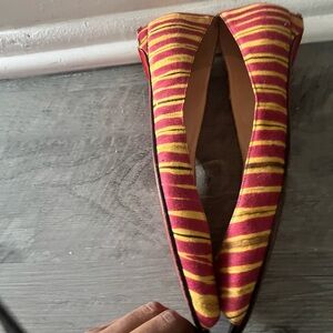 Elegant flats with a striking red and yellow design. Features a stylish peep toe and only needs new taps. No dust bag or box. Ships from a smoke and pet free home!