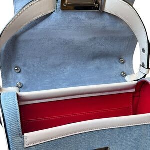 Noted Wear: Some leather marks on white band, right side. Mark on white closure strap. Some fading on denim on top sides. Interior pen/ink stains.