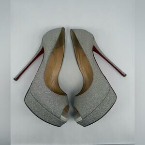 Christian Louboutin Silver/ Snow glitter Fetish 150mm peep toe pumps EU 41
