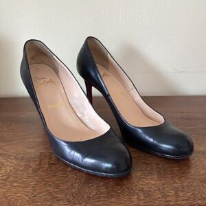 Uppers look like new, no nicks to the leather or wear to the toe. See heel measurement. They are 3” but I believe Louboutin classifies as 100mm.
