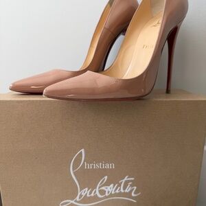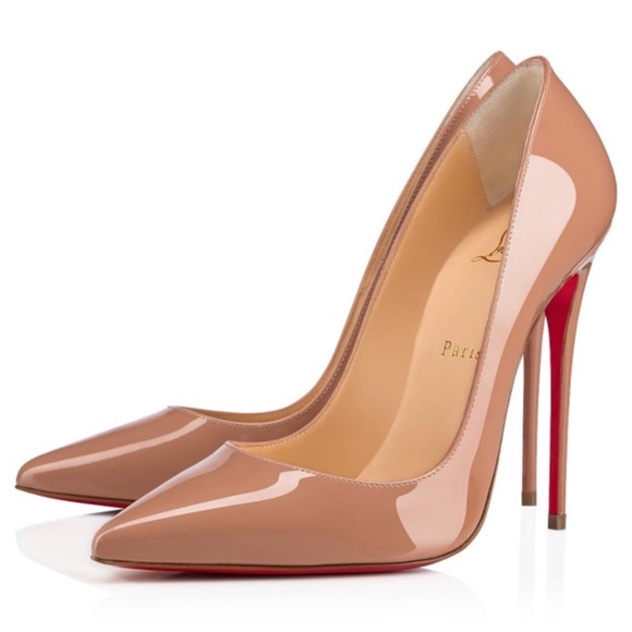 The So Kate iconic pump with timeless elegance brilliantly combines discretion and sophistication. Its all beige Blush patent calfskin features a sculpted upper that extends its lines to the iconic bold cut. It sits easy atop a slender 120 mm heel to give you confidence, underlining Maison Christian Louboutin know-how.