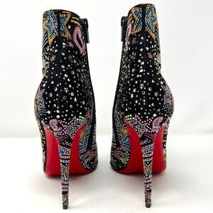 Style Details: Black suede upper with multicolor graphic crystal embellishments, pointed toe, inner side zip, classic red lacquered sole, and 4.25-inch stiletto heel.