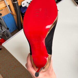 Color: Black suede/leather with gold heel & mixed-tone(gold/silver/black) spikes and red sole
