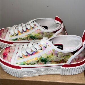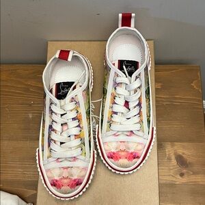 Christian Louboutin Super Pedro Platform Sneaker in beautiful floral pattern. Never worn or used. No longer have the box, dust bags are included. I have an extra box from another pair of shoes, can include upon request. Love the color and shape, unfortunately, need a bigger size. Please view all photos and ask any questions. Open to reasonable offers.