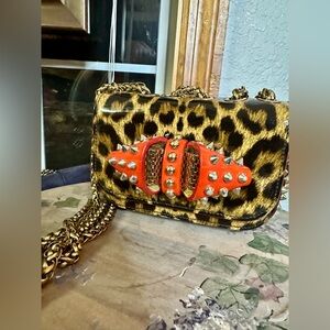 • Color/Material: Leopard-print patent leather with spiked red/orange bow detail and gold-toned chain strap