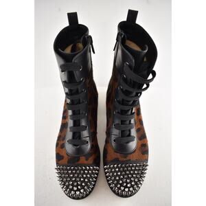 Christian Louboutin TS Croc Flat Black Leopard Pony Spike Combat Ankle Boot 38