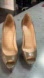 Chic taupe heels with signature red soles. Peep-toe design for a stylish look.