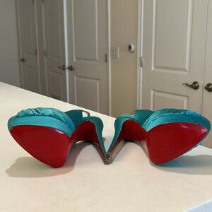 Silk-like material (not suede), turquoise, Christian Louboutin heels -- used twice, like brand new! Size 38