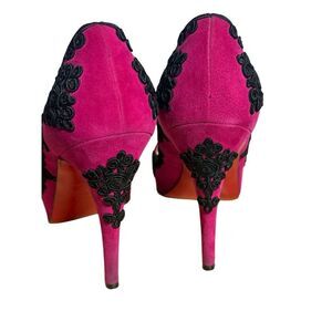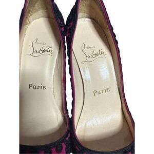 “These classic stilettos are crafted of pink (magenta) suede leather with black textured embroidered thread creating swirled patterns and trim. They feature a 4.5 inch heel wrapped in pink suede with black detailing, a peep toe and the iconic red lacquered soles.”